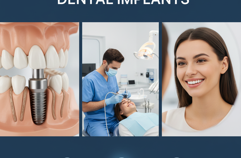 A dental implant is a small titanium or zirconia post surgically placed into the jawbone to replace a missing tooth root. Over time, the implant integrates with the bone through a process called osseointegration, creating a stable foundation for a dental crown or bridge that looks and functions like a natural tooth.